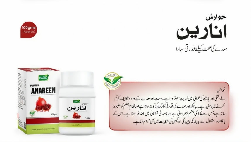 حازق جوارِش انارین ایک قدرتی یونانی ہربل فارمولا ہے جو خاص طور پر خواتین کی معدے کی صحت کو بہتر بنانے کے لیے تیار کیا گیا ہے۔ یہ معدے کی بے آرامی، گیس اور بدہضمی سے نجات دینے کے لیے مفید ہے اور ہاضمے کے عمل کو بہتر بناتا ہے۔ انار کی قدرتی طاقت سے بھرپور یہ فارمولہ معدے کی جلن اور تیزابیت کو کم کرتا ہے۔