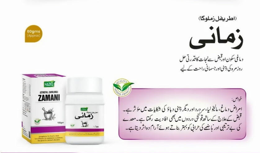 حازق زمانہ ایک قدرتی یونانی ہربل سپلیمنٹ ہے جو دل، دماغ اور معدے کی صحت کو بہتر بنانے کے لیے تیار کیا گیا ہے۔ یہ قوت مدافعت کو بڑھاتا ہے، دل کی بیماریوں سے بچاتا ہے، دماغی تناؤ اور بے چینی کو دور کرتا ہے اور معدے کی صحت کو بہتر بناتا ہے۔